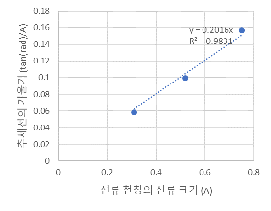 또, 이론에 의하면 점들이 이루는 직선의 기울기가 솔레노이드에 흐르는 전류의 크기에 비례해야 한다. 추세선의 기울기가 솔레노이드에 흐르는 전류의 크기에 따라 어떻게 변화하는지 그래프로 나타내고 그 분포가 얼마나 직선에 가까운지 확인하여 이론에 부합한 결과가 나왔는지 보았다.